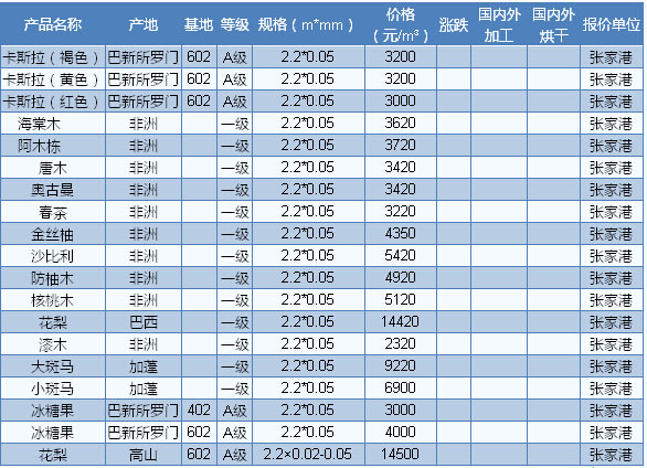 木材市場(chǎng)聯(lián)盟新動(dòng)態(tài):隨著市場(chǎng)活躍度的不斷提升,近期張家港巴新材、所羅門(mén)材價(jià)格有所上漲,漲幅普遍在100-300元/立方米。目前張家港冰糖果(海棠)1800-2200元/立方米,阿摩楝 1600-1900元/立方米,山檨?zhàn)?200-1300元/立方米,山桂花 1500-1700元/立方米,翅蘋(píng)婆 1100-1300元/立方米,欖仁 1600-1800元/立方米,米籽蘭 1500-1700元/立方米。
